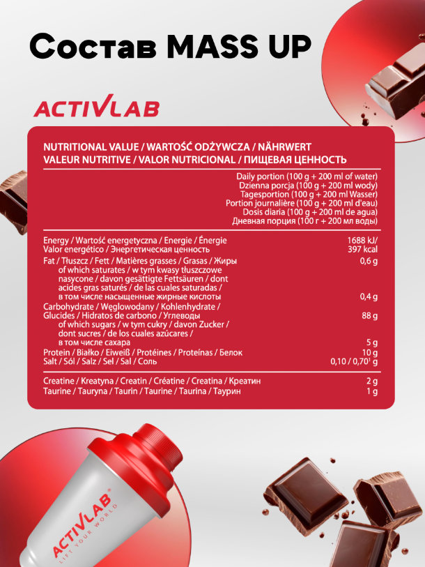 ActivLab MASS UP — это профессиональная высококалорийная пищевая добавка, специально разработанная для эффективного набора мышечной массы и увеличения силовых показателей. Продукт представляет собой сбалансированную формулу, которая сочетает в себе быстроусвояемые углеводы, качественный белок и мощные анаболические компоненты для достижения максимальных результатов.