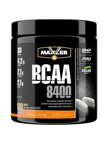 Maxler Amino BCAA 8400 mg — незаменимые аминокислоты (Лейцин, Валин и Изолейцин) в классическом соотношении 2.1.1, представленные в виде таблеток. Добавка способствует росту мышечной ткани, увеличению эффективности физических нагрузок, препятствует образованию молочной кислоты в мышцах, а значит снижает болевые ощущения, а также ускоряет регенерацию организма, подготавливая его к следующей тренировке.