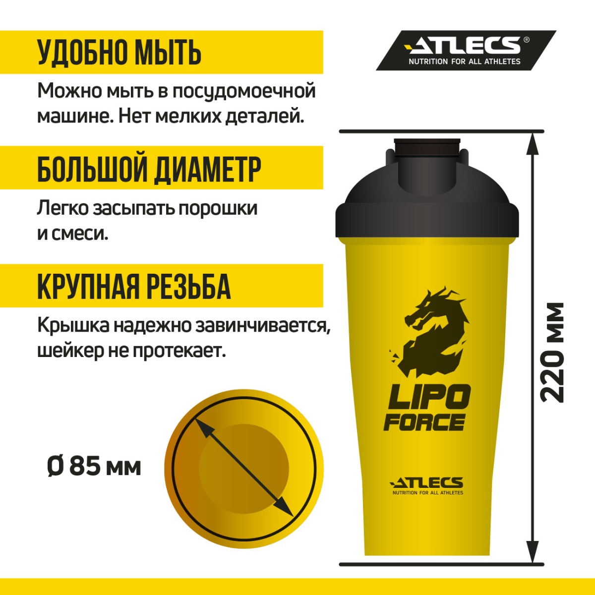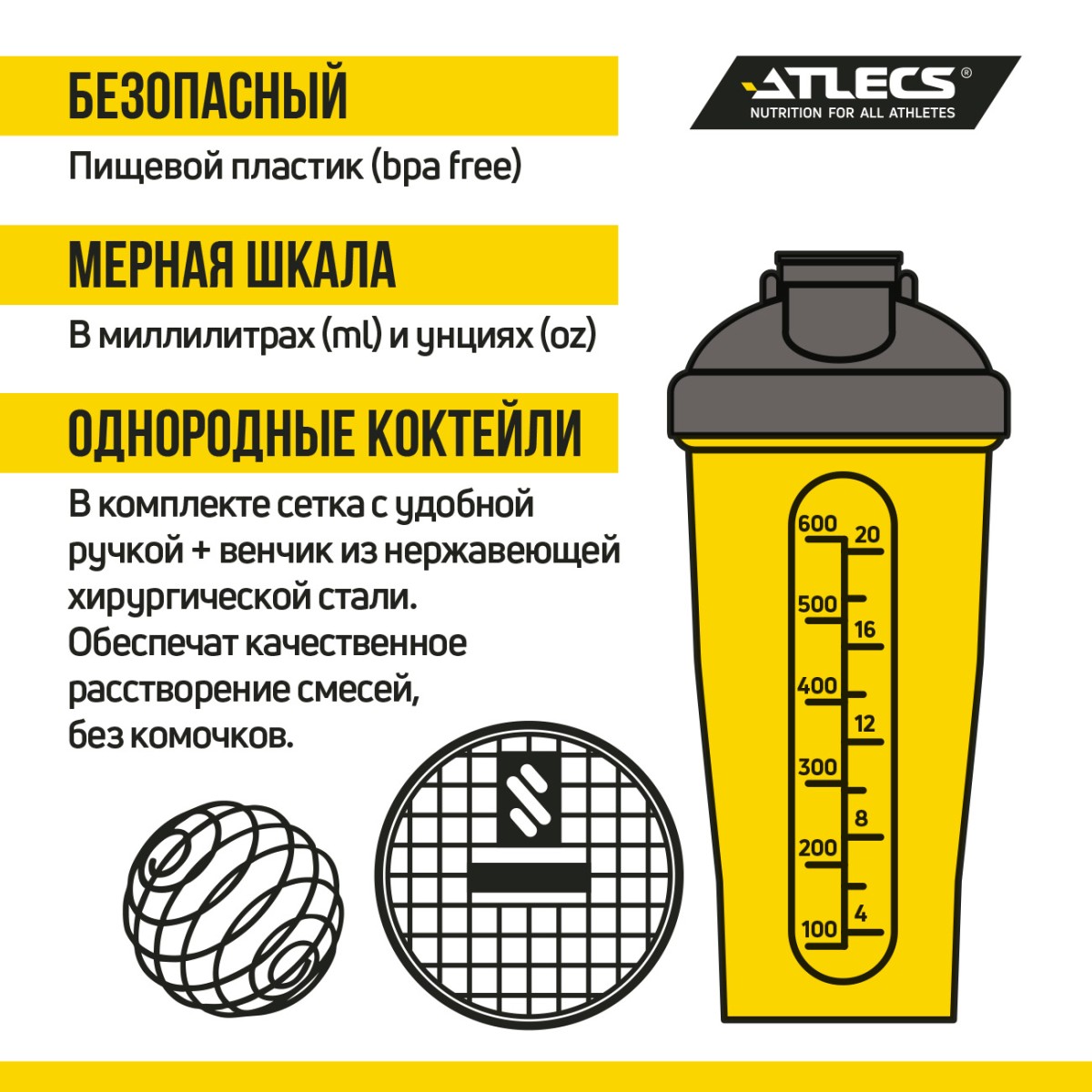 Atlecs Lipo Forсe Шейкер для спортивного питания C01, 600 мл, желтый