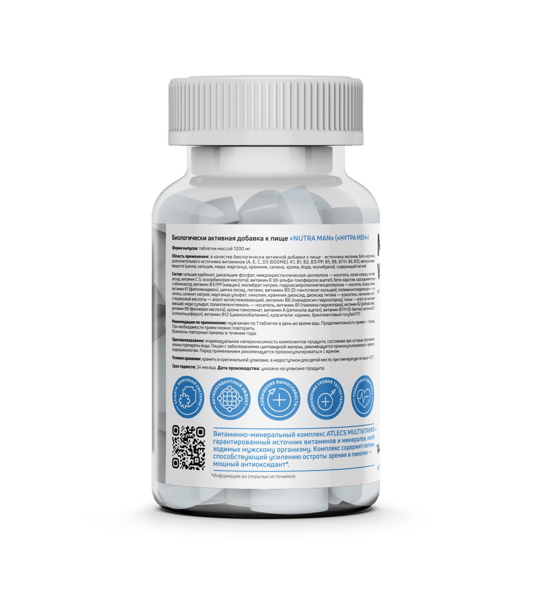 ATLECS Vita Man — это комплексный витаминно-минеральный препарат, созданный с учётом физиологических потребностей мужского организма. В его формулу включены тринадцать жизненно важных витаминов, девять минералов, а также уникальные фитонутриенты — лютеин и ликопин, действующие синергично для поддержания здоровья на всех уровнях. Добавка эффективно восполняет суточную потребность в микронутриентах, недостаток которых часто возникает при интенсивных тренировках, профессиональном стрессе или несбалансированном рационе. Витамины группы В ускоряют метаболизм, поддерживают стабильную работу нервной системы и способствуют быстрому восстановлению сил. Витамин D3 в сочетании с кальцием и магнием укрепляет опорно-двигательный аппарат, повышает мышечный тонус и снижает риск судорог. Ликопин является мощным антиоксидантом, который защищает клетки от разрушительного действия свободных радикалов, поддерживает здоровье сердечно-сосудистой системы и предстательной железы. Лютеин концентрируется в тканях глаза, улучшая зрительную адаптацию, снижая нагрузку при работе с цифровыми устройствами и сохраняя чёткость зрения. Регулярное применение комплекса помогает стабилизировать иммунитет, улучшить качество сна и повысить общую выносливость. Продукт изготовлен по строгим стандартам качества, не содержит калорий и искусственных добавок в критических дозах, что гарантирует безопасность и высокую биодоступность каждого компонента.