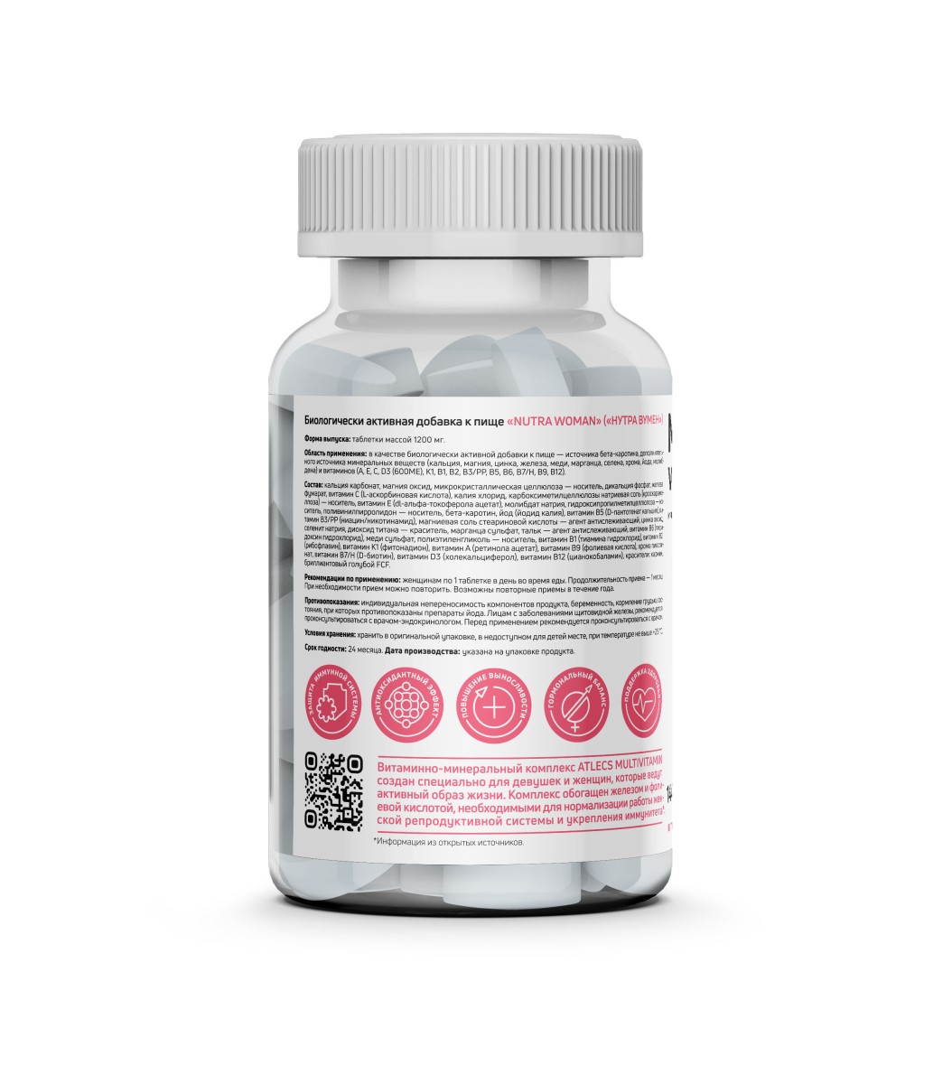 Atlecs Nutra Woman — это специализированный витаминно-минеральный комплекс, разработанный для комплексной поддержки здоровья и активного образа жизни современных женщин. Уникальная формула содержит 13 витаминов и 12 минералов, подобранных в оптимальных пропорциях для эффективного усвоения и синергетического действия. Регулярный приём добавки способствует укреплению естественных защитных сил организма, повышению устойчивости к стрессам и сезонным нагрузкам. Активные компоненты помогают нормализовать энергетический обмен, снижая чувство усталости и поддерживая высокую работоспособность на протяжении всего дня. Особое внимание уделено нутриентам, необходимым для поддержания внешней красоты: они стимулируют естественные процессы обновления клеток, улучшают состояние кожи, укрепляют волосы и ногти. Комплекс также благотворно влияет на нервную систему, способствуя эмоциональному равновесию и качественному восстановлению.