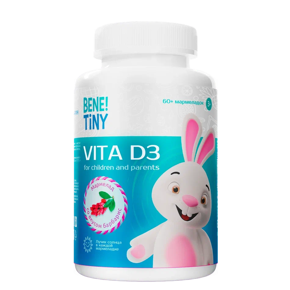 Заботьтесь о здоровье всей семьи с удовольствием! BENE! TINY VITA D3 — это не просто витамин D3, а настоящий вкусный ритуал заботы о себе и близких. 60 мягких мармеладных пастилок с нежным ягодным вкусом «барбарис» превращают ежедневный приём витамина в приятное удовольствие — без таблеток, без горечи, без усилий. Каждая пастилка содержит 15 мкг (600 МЕ) холекальциферола — оптимальную дозу для поддержания нормального уровня витамина D в организме.