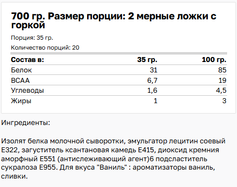 Каждая порция продукта весом 35 грамм содержит 31 грамм белка! Его регулярное употребление способствует значительному ускорению мышечного роста и обеспечивает быстрое и качественное восстановление после интенсивных тренировок. Продукт станет вашим надежным союзником не только в наборе массы, но и в период «сушки» и работы на рельеф, так как он помогает эффективно снижать лишнюю жировую массу, сохраняя при этом сухую мышечную.