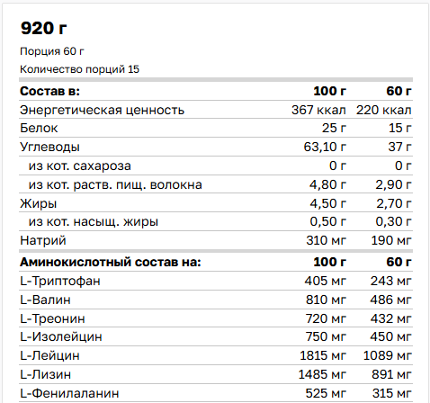 Особое внимание в формуле уделено легкости усвоения. Растворимые пищевые волокна (4,80 г на 100 г) в составе способствуют нормальной работе пищеварительной системы даже при высокой калорийности продукта, предотвращая ощущение тяжести и дискомфорта. Каждая порция в 60 г содержит 220 ккал, 15 г высококачественного белка и 37 г полезных сложных углеводов, что делает ее идеальным приемом пищи для набора массы.