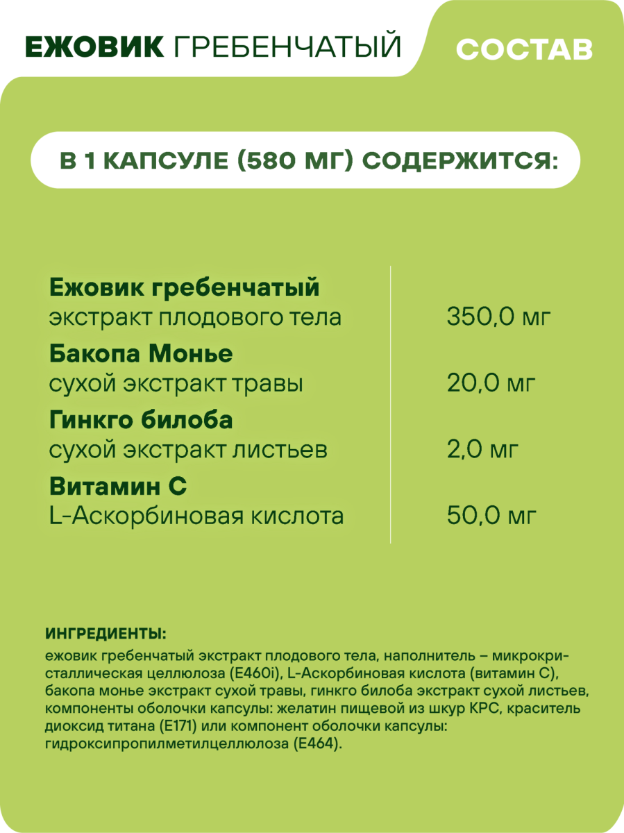 Для усиления действия ежовика и комплексного подхода к здоровью мозга формула была обогащена тремя мощными компонентами. Экстракт бакопы монье, известное аюрведическое растение, традиционно используется для улучшения памяти и когнитивных функций. Гинкго билоба, пожалуй, самый знаменитый растительный помощник для мозга, работает над улучшением микроциркуляции и кровоснабжения cerebral, обеспечивая нервные клетки необходимым кислородом и питательными веществами. Завершает синергичную формулу витамин C — мощный антиоксидант, который защищает клетки мозга от окислительного стресса и способствует укреплению общего иммунитета.