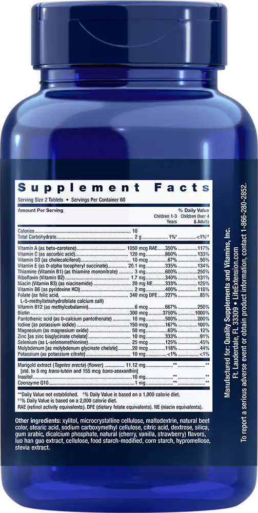 Заботьтесь о здоровье и энергии вашего ребёнка с Life Children's Formula от Life Extension — уникальной жевательной мультивитаминной формулой, разработанной специально для детей старше 4 лет. Эта добавка не просто восполняет дефицит витаминов и минералов — она поддерживает рост, развитие, иммунитет, когнитивные функции и общее самочувствие в активном детском возрасте. Сбалансированный состав включает ключевые витамины группы B, витамины A, C, D, E, а также цинк, селен, йод и магний — все в безопасных и легко усваиваемых дозах, адаптированных под потребности растущего организма.