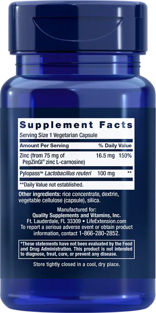 Life Gastro-Ease — это инновационная биологически активная добавка, разработанная для комплексной поддержки здоровья желудка и улучшения пищеварения. Каждая растительная капсула содержит уникальную комбинацию двух ключевых компонентов: высокобиодоступного цинка в форме PepZinGI® (цинк L-карнозин) и специализированного штамма пробиотика Lactobacillus reuteri Pylopass™. Цинк L-карнозин, благодаря своей стабильной молекулярной структуре, эффективно связывается с слизистой оболочкой желудка, способствуя её защите и восстановлению. Пробиотик Pylopass™, в свою очередь, помогает поддерживать здоровый баланс микрофлоры желудка, нейтрализуя потенциально вредные бактерии без нарушения естественной флоры кишечника.
