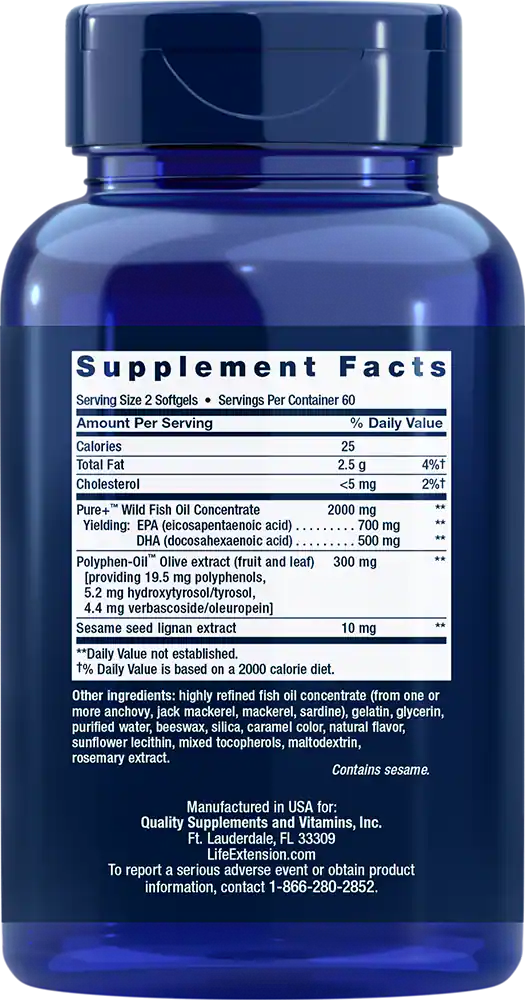 Формула дополнительно обогащена уникальным комплексом антиоксидантов: экстрактом оливы Polyphen-Oil™ (300 мг), богатым полифенолами, гидрокситирозолом и олеуропеином, а также экстрактом лигнанов кунжута (10 мг). Эти компоненты защищают омега-3 от окисления, усиливая их эффективность и способствуя долгосрочной стабильности клеточных мембран. Комплекс помогает поддерживать здоровье сосудов, нормализовать давление и укреплять иммунитет. Идеально подходит для ежедневного приёма тем, кто стремится к активному и здоровому образу жизни. Производитель — компания Life Extension, известная научно обоснованными формулами и строгим контролем качества.