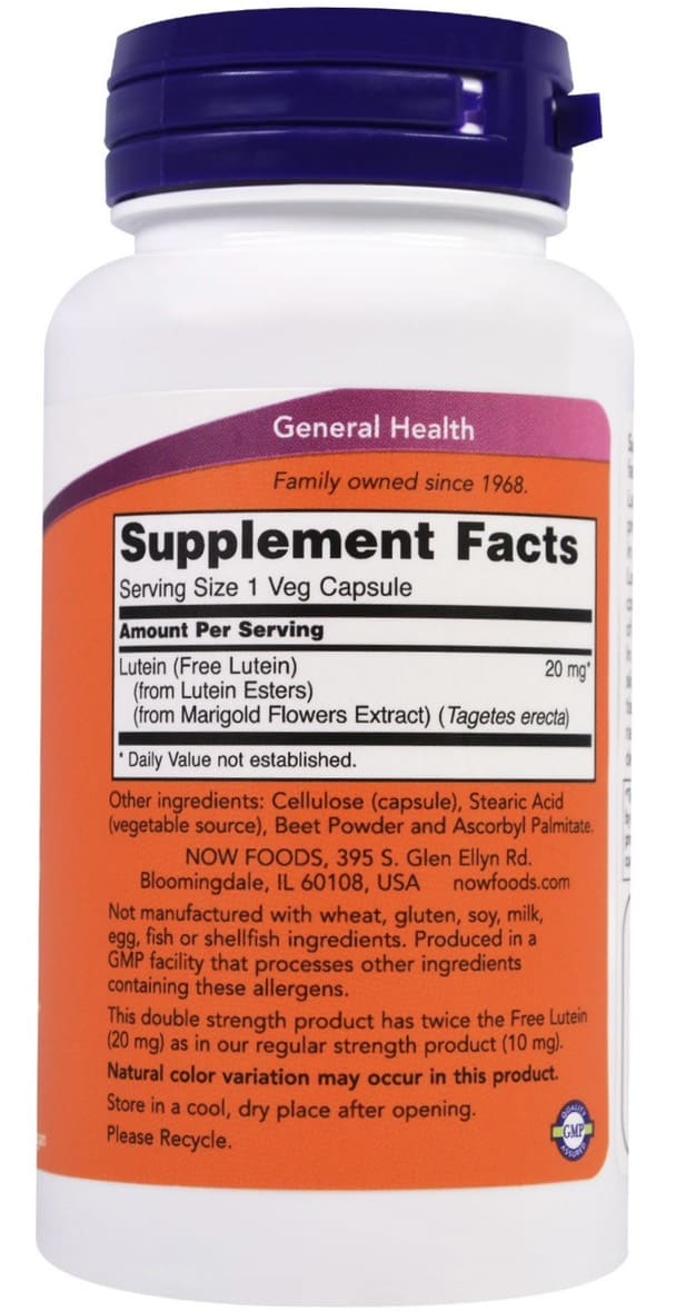 NOW Lutein 20 mg содержит высокую дозу свободного лютеина (20 мг на капсулу), что в два раза превышает стандартную дозировку, делая его особенно эффективным для тех, кто испытывает повышенную нагрузку на зрение. Источником лютеина служит экстракт цветков бархатцев (Tagetes erecta) — натуральный и проверенный ингредиент, богатый антиоксидантами. Добавка не содержит глютен, сою, молоко, яйца и другие распространённые аллергены, что делает её безопасной для большинства людей.