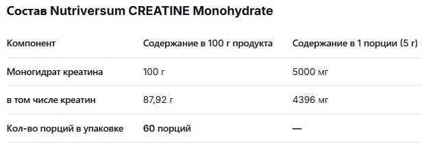 Содержание креатина: В 5 г (1 порция) продукта содержится 4396 мг (около 4.4 г) чистого креатина.