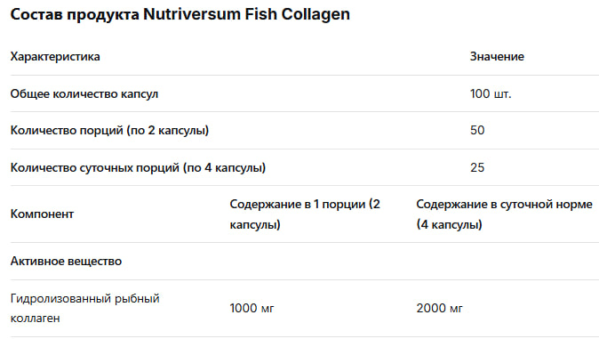 Активное вещество: Гидролизованный рыбий коллаген (1000 мг на порцию из 2 капсул).