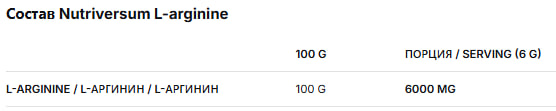 Активный компонент: L-Аргинин (в свободной форме) — 6000 мг (6 г).