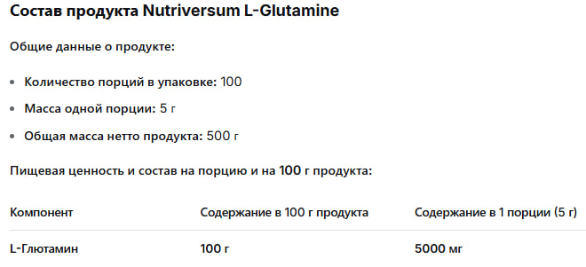 L-Глютамин: 5000 мг на порцию (1 мерная ложка).