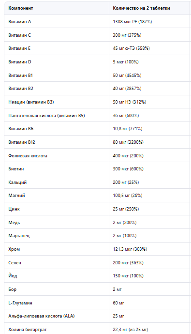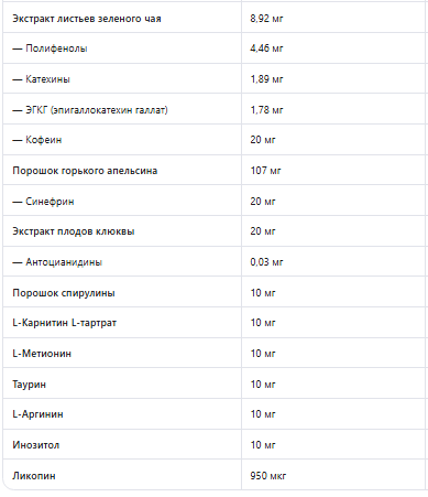 Витамины: A, C, D, E, B1 (тиамин), B2 (рибофлавин), B3 (ниацин), B6, B12, фолиевая кислота, биотин, пантотеновая кислота. Минералы: кальций, магний, цинк, медь, марганец, хром, селен, йод, бор. Аминокислоты и другие вещества: L-глутамин, альфа-липоевая кислота (ALA), холина битартрат, L-карнитин, L-метионин, таурин, L-аргинин, инозитол. Растительные экстракты: экстракт листьев зеленого чая (полифенолы, катехины, EGCG, кофеин), порошок горького апельсина (синефрин), экстракт плодов клюквы (антоцианидины), порошок спирулины, ликопин. Вспомогательные вещества: наполнитель (целлюлоза), карбонат кальция, агенты покрытия (мальтодекстрин, тальк, гуаровая камедь, гидроксипропилметилцеллюлоза, поливиниловый спирт, триглицериды средней цепи), стабилизатор (поливинилпирролидон), красители (понсо 4R, желтый закат FCF, индигокармин).
