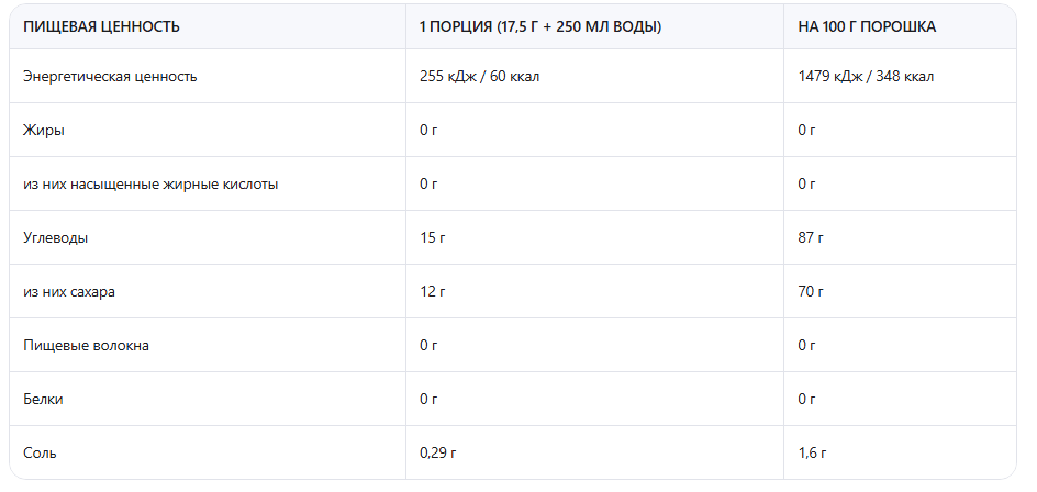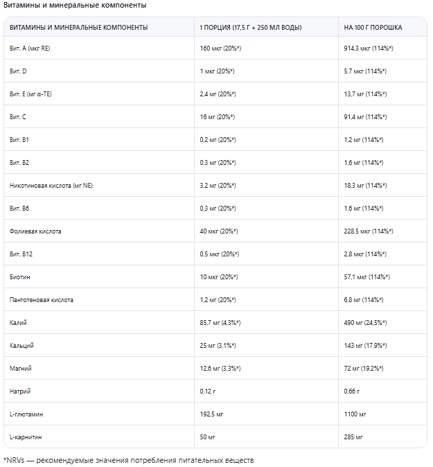 Ингредиенты: сахар, мальтодекстрины, глюкоза, фруктоза, регуляторы кислотности — лимонная кислота, яблочная кислота; минеральные компоненты (3,1 %) (хлорид натрия, калиевая соль ортофосфорной кислоты, кальциевая соль ортофосфорной кислоты, цитрат натрия, карбонат магния); загустители — камедь акации (гуммиарабик), ксантановая камедь, карбоксиметилцеллюлоза натрия; ароматизаторы; L-глутамин (1,1 %); L-карнитин L-тартрат (0,4 %); витамины (0,23 %) (L-аскорбиновая кислота — витамин С, DL-альфа-токоферилацетат — витамин Е, никотинамид — ниацин, D-биотин, ретинилацетат — витамин А, кальция D-пантотенат — пантотеновая кислота, гидрохлорид пиридоксина — витамин В6, холекальциферол — витамин D, птероилмоноглутаминовая кислота — фолиевая кислота, тиамина мононитрат — витамин В1, рибофлавин — витамин В2, цианокобаламин — витамин В12); подсластители — ацесульфам К, сукралоза, цикламаты; красители: рибофлавин (для лимонного вкуса), бета-каротин, кармин, рибофлавин (для апельсинового вкуса), Е 133 (для тропического синего вкуса), Е 150d (для колы).