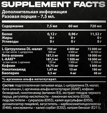L-цитруллина малат (6000 мг, из них 4000 мг цитруллина): Ключевой компонент для пампа. В организме преобразуется в L-аргинин, способствуя выработке оксида азота (NO), который расширяет сосуды и улучшает кровоток.