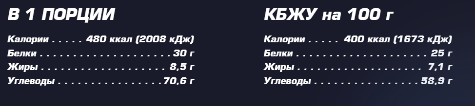 • Высокая калорийность — 480 ккал на порцию для эффективного набора массы