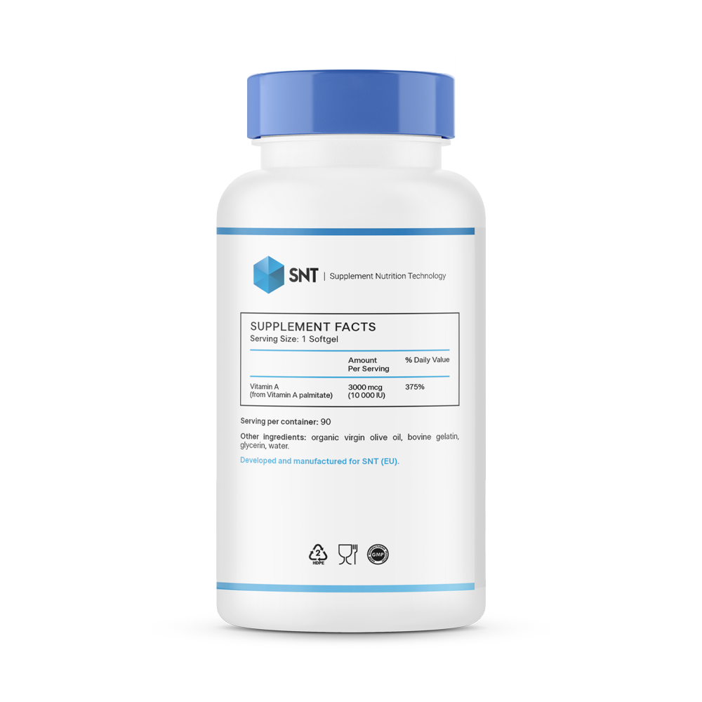 SNT A 10000 IU — это биологически активная добавка в удобной форме мягких капсул (софтгелей), каждая из которых содержит высокую дозу витамина А в размере 10 000 МЕ. Витамин А является ключевым элементом для поддержания здоровья зрения, иммунной системы и процессов клеточного обновления. В качестве источника используется хорошо усваиваемая форма пальмитата. Капсулы изготовлены на основе органического оливкового масла первого отжима, что способствует оптимальному усвоению этого жирорастворимого витамина. Упаковки из 90 капсул хватит на полноценный курс приема. Продукт не является лекарственным средством.