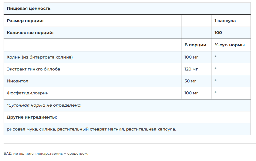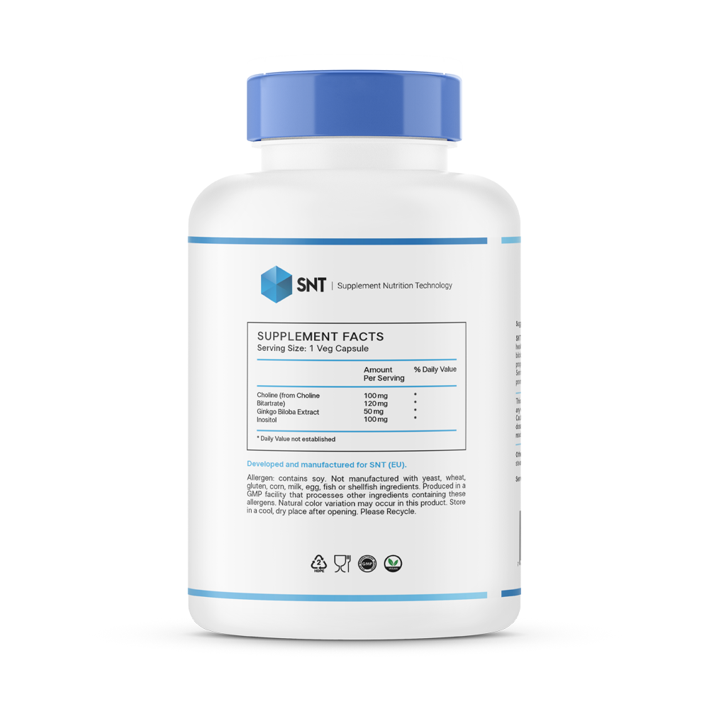 Холин — важнейший предшественник ацетилхолина, нейромедиатора, отвечающего за передачу сигналов в мозге. Экстракт гинкго билоба способствует улучшению кровотока в головном мозге, обеспечивая клетки кислородом и питательными веществами. Инозитол помогает стабилизировать настроение и снижать уровень стресса, а фосфатидилсерин — поддерживает целостность клеточных мембран нейронов, замедляя возрастные изменения в мозге и улучшая его адаптацию к нагрузкам.