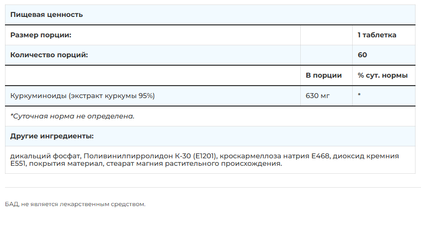 · Высокая концентрация активных веществ: 630 мг куркуминоидов в каждой таблетке, полученных из экстракта куркумы с высокой степенью очистки (95%).