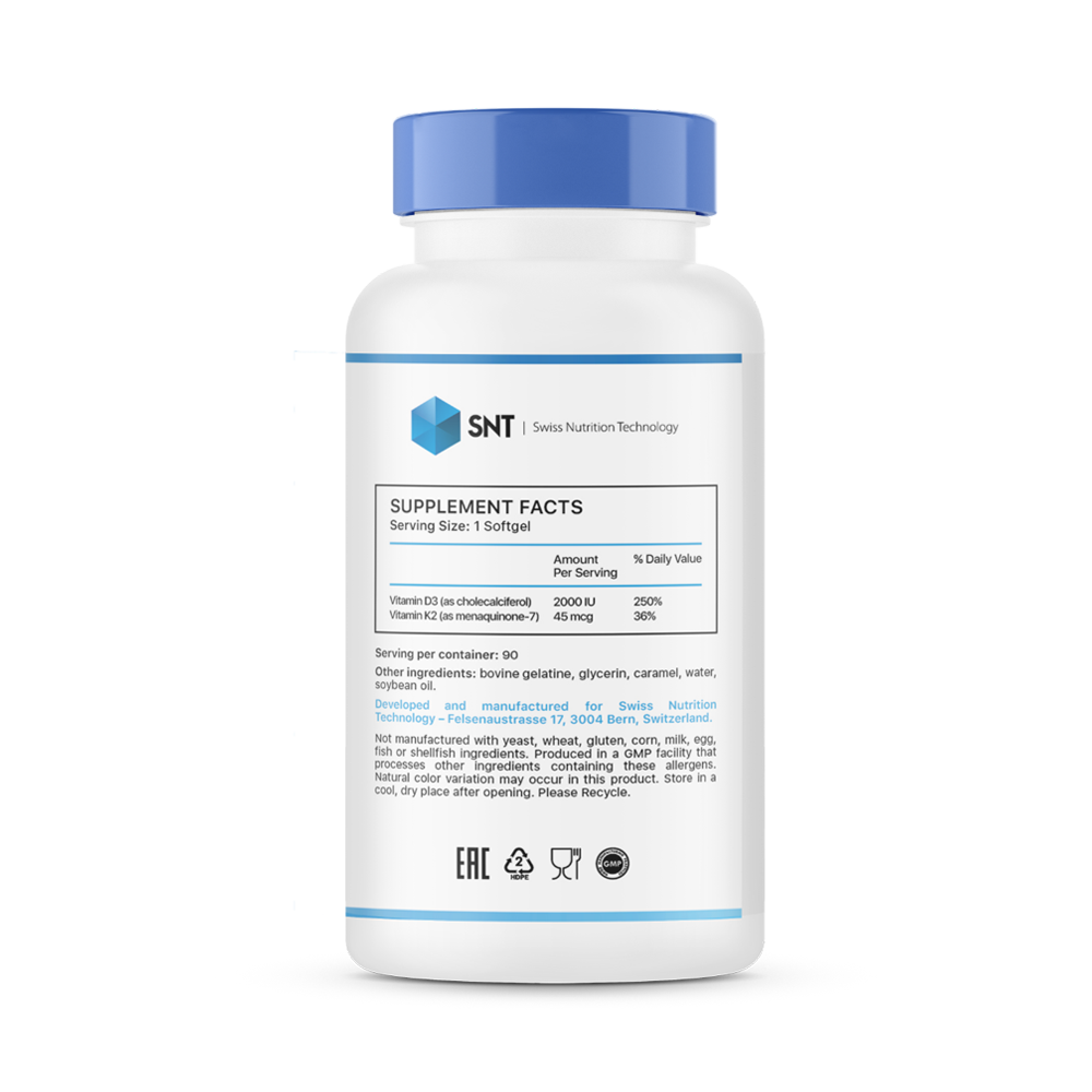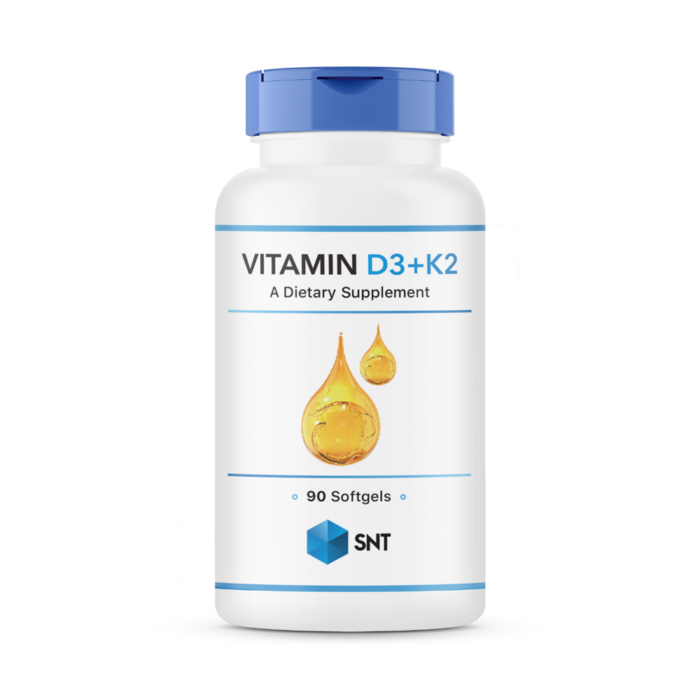 SNT D3+K2 — это высокоэффективная биологически активная добавка, созданная для комплексной поддержки вашего здоровья. Каждый софтгель содержит мощную дозу витамина D3 (2000 МЕ) и витамина K2 в его наиболее биодоступной форме МК-7 (45 мкг). Эта синергичная формула направлена на оптимальное усвоение кальция, что крайне важно для поддержания прочности костей и здоровья сердечно-сосудистой системы. Витамин D3 способствует усвоению кальция из пищи, а витамин K2 направляет его непосредственно в костную ткань, предотвращая отложение в сосудах. Удобная форма мягких капсул (софтгелей) обеспечивает легкое проглатывание и высокую усвояемость.