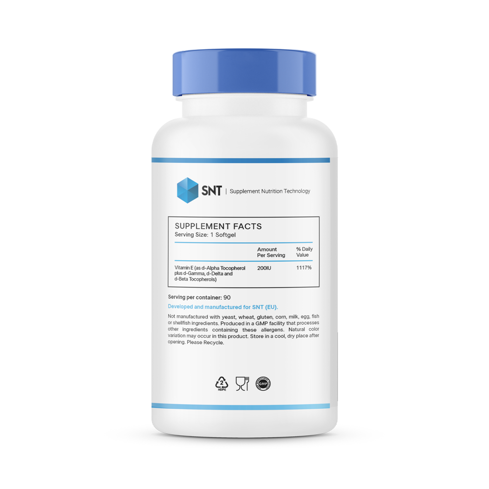 Витамин Е — один из главных антиоксидантов организма, который нейтрализует свободные радикалы, замедляя процессы старения и снижая риск хронических заболеваний. Смешанные токоферолы работают синергетически: d-альфа-токоферол — основной защитник клеточных мембран, а гамма- и дельта-формы усиливают его действие, особенно в борьбе с воспалениями и повреждением ДНК. Регулярный приём SNT E-200 способствует улучшению кровообращения, укреплению сердечно-сосудистой системы, повышению физической выносливости и ускорению восстановления после нагрузок.