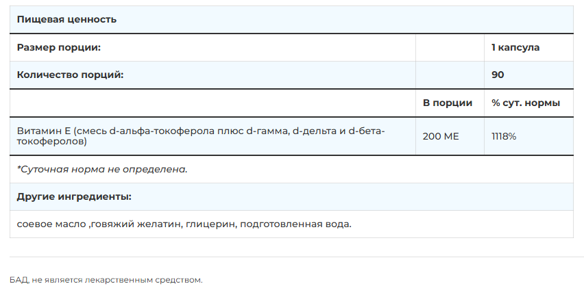 Добавка представлена в удобной форме софтгелей на основе соевого масла, что обеспечивает отличную усвояемость жирорастворимого витамина Е. Продукт не содержит искусственных красителей, консервантов или ароматизаторов — только чистые, проверенные ингредиенты.