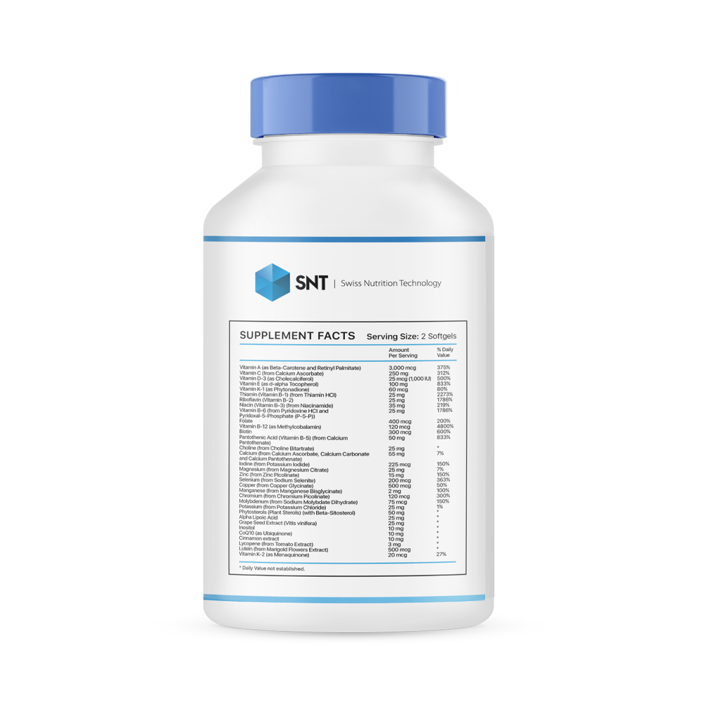 SNT Gent’s Multi — это мощный мультивитаминный комплекс в удобных мягких капсулах, созданный с учетом потребностей активных мужчин. Формула премиум-класса содержит более 20 жизненно важных витаминов, минералов и эксклюзивных фитонутриентов. Комплекс отличается высокой биодоступностью, используя лучшие формы компонентов, такие как хелатные минералы (пиколинат цинка, глицинат меди), метилкобаламин (витамин B12) и активные коферменты (пиридоксаль-5-фосфат). В состав также включены мощные антиоксиданты — альфа-липоевая кислота, экстракт виноградных косточек и CoQ10, которые способствуют защите клеток от окислительного стресса. Добавка поддерживает здоровый уровень энергии, работу иммунной и сердечно-сосудистой систем, а также общее состояние здоровья.