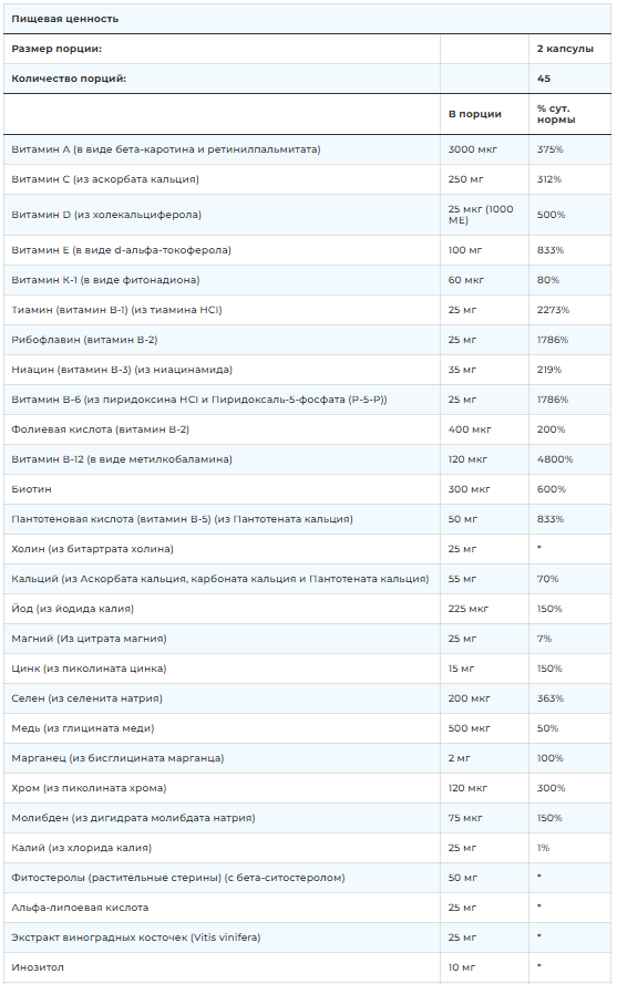 · Всесторонняя поддержка: Широкий спектр витаминов и минералов покрывает 100% и более от суточной потребности в большинстве ключевых нутриентов.