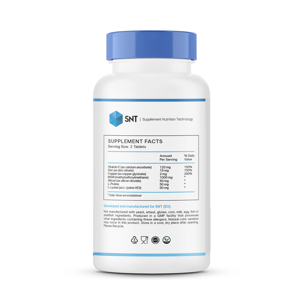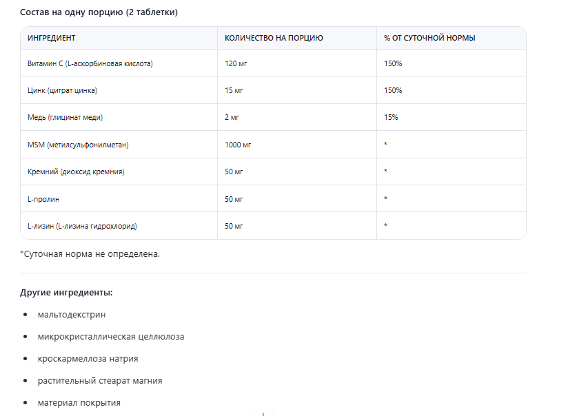 · Сбалансированный состав: Включает не только витамины и минералы, но и "строительные блоки" коллагена — аминокислоты L-пролин и L-лизин, а также MCM (метилсульфонилметан) для дополнительной поддержки соединительной ткани.