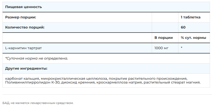 · Высокая дозировка: Содержит 1000 мг L-карнитина в одной таблетке.