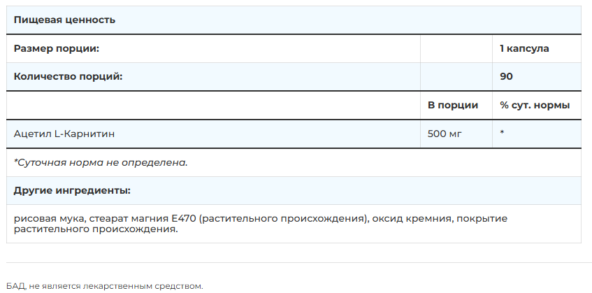 - Высокая концентрация — 500 мг ацетил-L-карнитина в одной капсуле