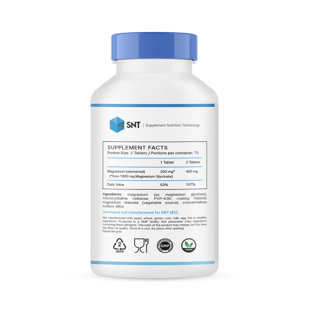 SNT Magnesium Glycinate — это высококачественная биологически активная добавка, обеспечивающая организм легкоусвояемой формой магния. Каждая таблетка содержит 200 мг чистого магния в форме глицината, которая известна своей высокой биодоступностью и мягким действием на желудочно-кишечный тракт. Это делает добавку оптимальным выбором для восполнения дефицита этого жизненно важного минерала. Магний играет ключевую роль в работе нервной системы, способствует снижению усталости и поддержанию энергетического обмена. В упаковке 150 таблеток, что рассчитано на 5 месяцев приема, обеспечивая удобство и экономию.