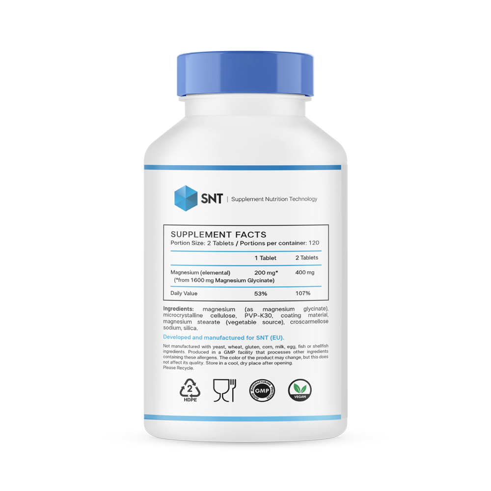 SNT Magnesium Glycinate — это высококачественная биологически активная добавка, обеспечивающая организм легкоусвояемой формой магния. Каждая таблетка содержит 200 мг чистого магния в форме глицината, которая известна своей высокой биодоступностью и мягким действием на желудочно-кишечный тракт. Это делает добавку оптимальным выбором для восполнения дефицита этого жизненно важного минерала. Магний играет ключевую роль в работе нервной системы, способствует снижению усталости и поддержанию энергетического обмена. В упаковке 90 таблеток, что рассчитано на 3 месяца приема, обеспечивая удобство и экономию.