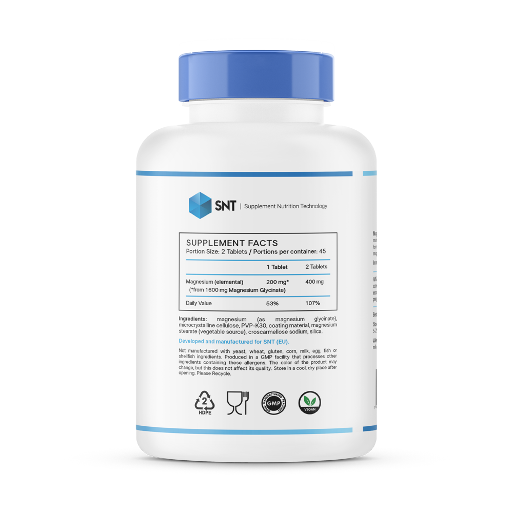 SNT Magnesium Glycinate — это высококачественная биологически активная добавка, обеспечивающая организм легкоусвояемой формой магния. Каждая таблетка содержит 200 мг чистого магния в форме глицината, которая известна своей высокой биодоступностью и мягким действием на желудочно-кишечный тракт. Это делает добавку оптимальным выбором для восполнения дефицита этого жизненно важного минерала. Магний играет ключевую роль в работе нервной системы, способствует снижению усталости и поддержанию энергетического обмена. В упаковке 90 таблеток, что рассчитано на 3 месяца приема, обеспечивая удобство и экономию.