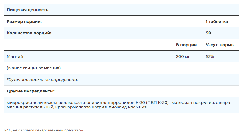 · Удобство приема: Всего 1 таблетка в день для восполнения 53% от суточной нормы потребления магния.