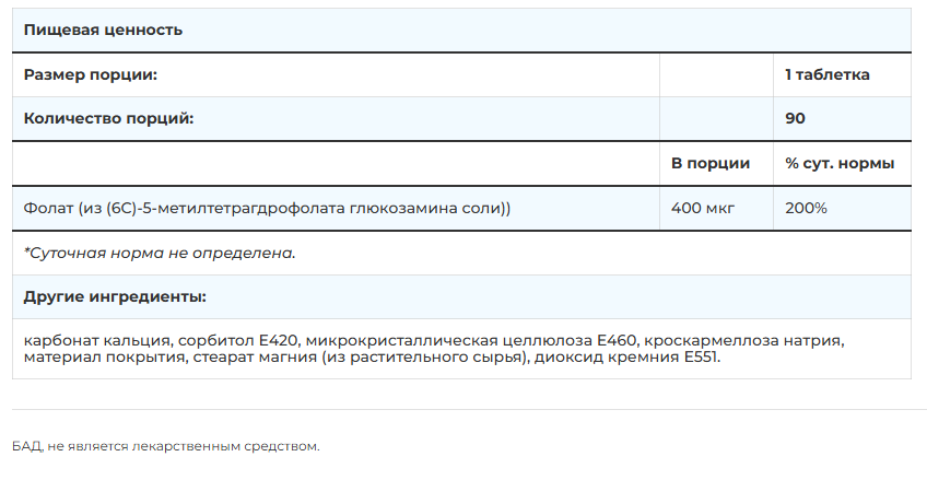 - Активная форма фолата — метилфолат (L-5-MTHF) усваивается организмом без дополнительных преобразований.