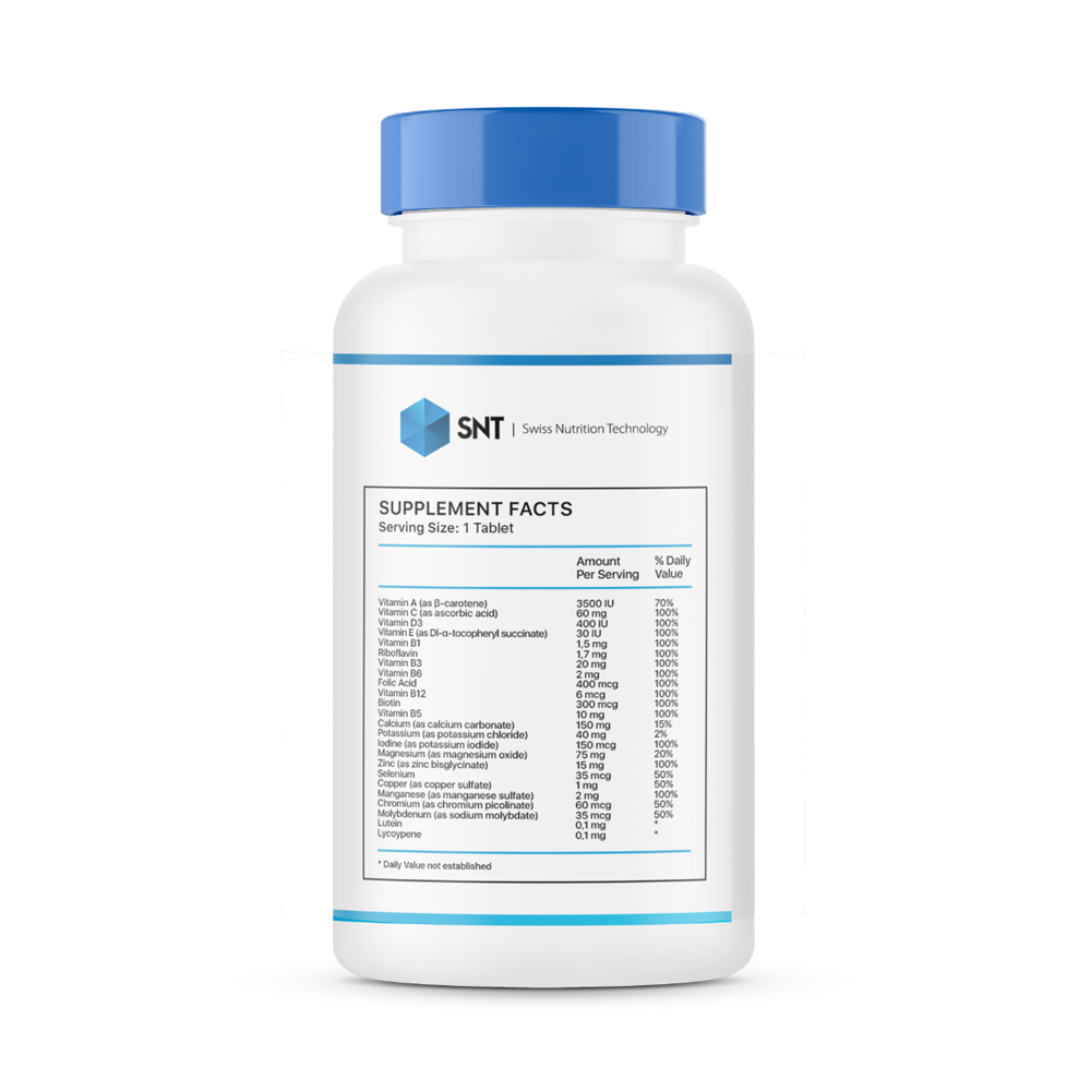 SNT Multivitamin Mineral — это сбалансированный комплекс из более чем 20 важнейших витаминов, минералов и антиоксидантов, разработанный для ежедневной поддержки вашего здоровья и благополучия. Формула содержит 100% от суточной нормы большинства витаминов группы B (B1, B2, B3, B6, B12), которые способствуют нормализации энергетического обмена и снижению усталости, а также ключевые антиоксиданты — витамины C и E. В состав также включены такие важные микроэлементы, как цинк и селен для поддержки иммунитета, йод для нормальной функции щитовидной железы и лютеин с ликопином для здоровья глаз. Комплекс предназначен для восполнения дефицита питательных веществ и идеально подходит для современного ритма жизни.