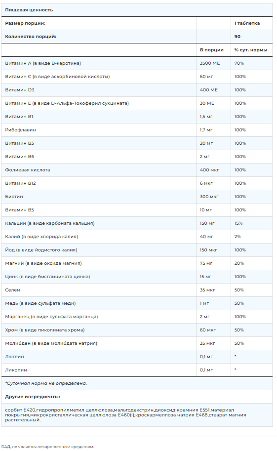 · Всесторонняя поддержка здоровья: Комплекс покрывает 100% суточной потребности в основных витаминах (C, D3, E, вся группа B) и ключевых минералах (йод, цинк, марганец).