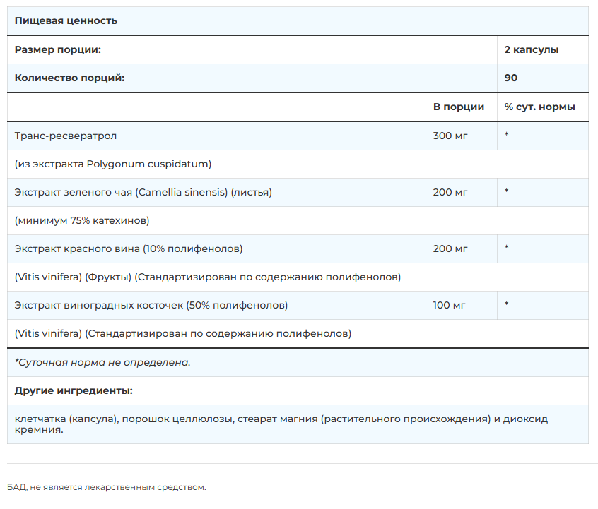 · Синергия ключевых экстрактов: Сочетание ресвератрола с катехинами зеленого чая и полифенолами винограда обеспечивает более полный и эффективный результат, чем прием каждого компонента по отдельности.
