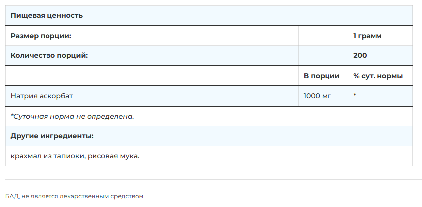 · Высокая дозировка: 1000 мг чистого натрия аскорбата в каждой порции (1 г).