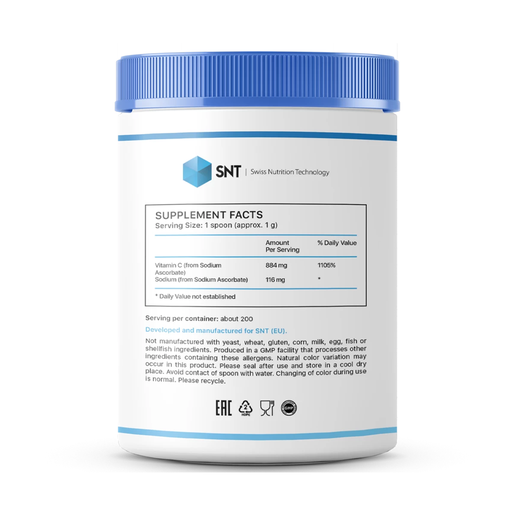 SNT Sodium Ascorbate — это биологически активная добавка к пище, представляющая собой буферизованную форму витамина C. В отличие от обычной аскорбиновой кислоты, аскорбат натрия не раздражает слизистую желудка, что делает его идеальным выбором для людей с чувствительным пищеварением. Продукт обладает нейтральным pH и легко усваивается организмом. Каждая порция весом 1 грамм содержит 1000 мг чистого натрия аскорбата. Добавка произведена из качественного сырья и не содержит лишних наполнителей, в качестве вспомогательных компонентов используются только крахмал из тапиоки и рисовая мука. Это эффективная поддержка для вашего иммунитета, борьбы с усталостью и укрепления стенок сосудов.