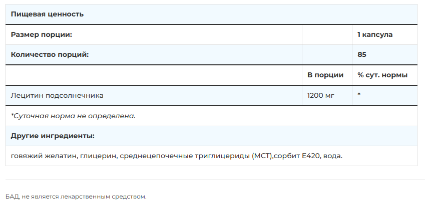 - 1200 мг чистого подсолнечного лецитина в одной капсуле