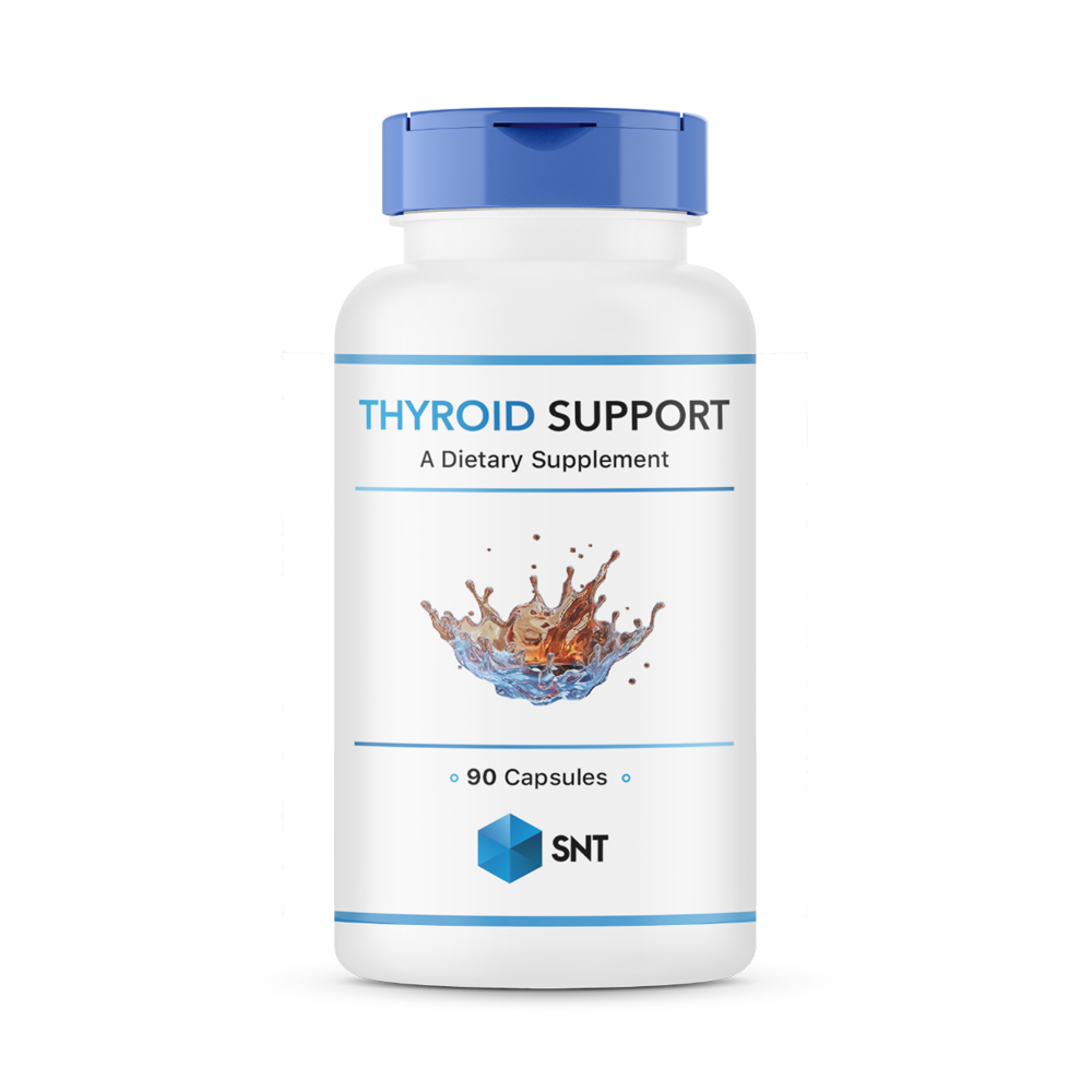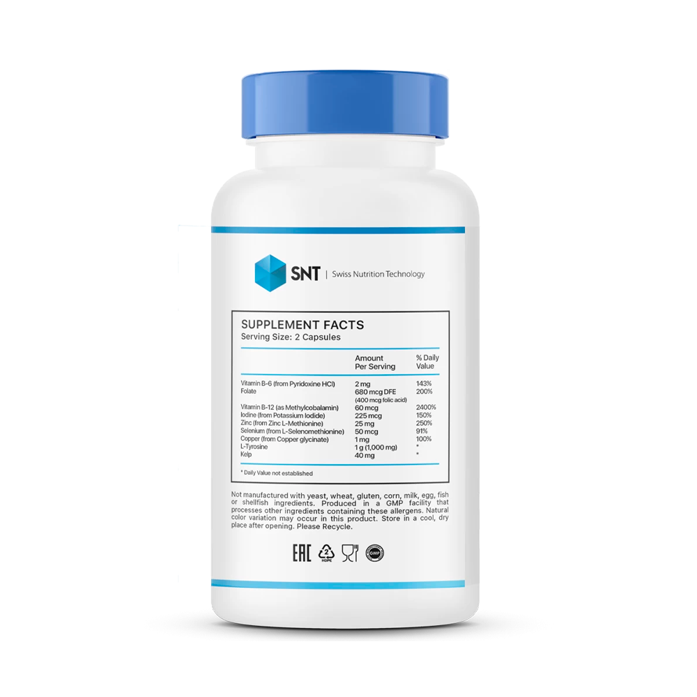 SNT Thyroid Support — это сбалансированная биологически активная добавка, созданная для комплексной поддержки здоровья щитовидной железы и нормализации метаболических процессов. Формула содержит ключевые витамины и минералы, необходимые для полноценного синтеза тиреоидных гормонов. В состав входят высокие дозировки витамина B12, йода, цинка и фолата, которые способствуют повышению энергетического тонуса и нормализации обмена веществ. L-Тирозин, являясь аминокислотой-предшественником гормонов, и натуральный келп работают синергично для оптимальной функции щитовидной железы. Добавка производится в легкоусвояемых хелатных формах, таких как L-селенометионин и L-метионин цинка, что обеспечивает максимальное усвоение питательных веществ. Рекомендуется в качестве дополнительного источника жизненно важных нутриентов.