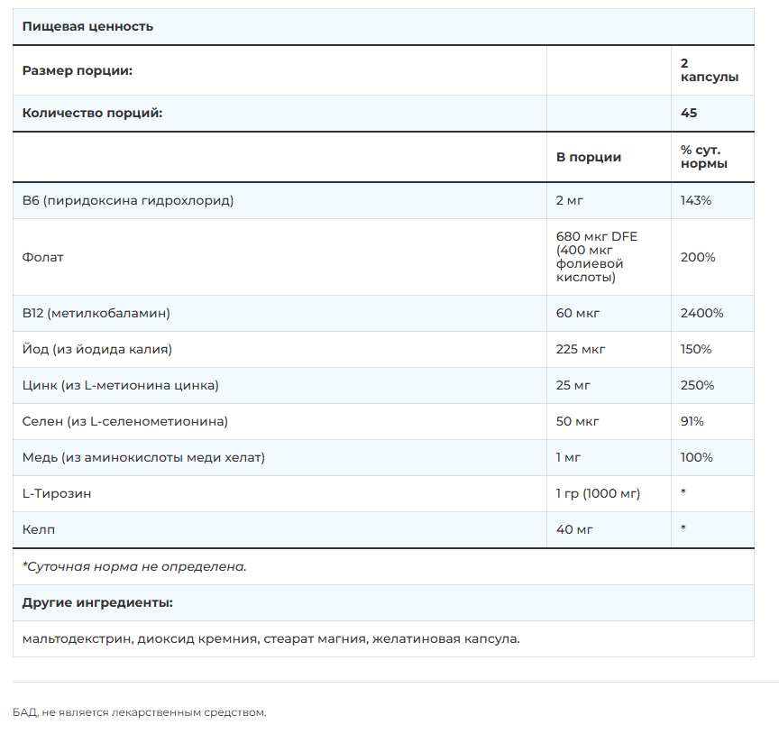 · Комплексная поддержка щитовидной железы: Содержит йод, селен, цинк и медь — незаменимые микроэлементы для синтеза и регуляции гормонов щитовидной железы.
