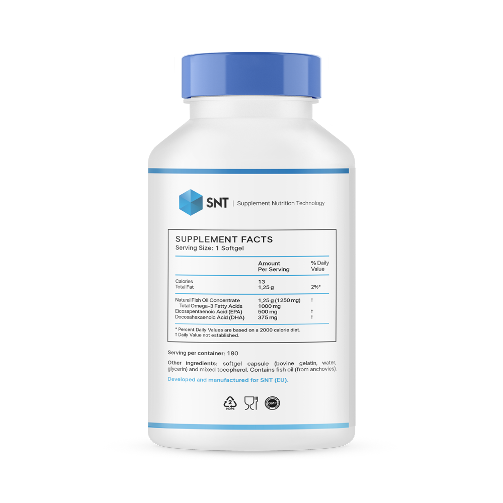 SNT ULTRA Omega-3 — это высококачественная биологически активная добавка, созданная для восполнения дефицита незаменимых жирных кислот в вашем рационе. Каждый софтгель содержит мощную дозу натурального концентрата рыбьего жира — 1250 мг, обеспечивая 875 мг ценнейших жирных кислот Омега-3 (500 мг ЭПК и 375 мг ДГК). ЭПК (эйкозапентаеновая кислота) и ДГК (докозагексаеновая кислота) играют ключевую роль в поддержании работы сердечно-сосудистой системы, мозга и зрения. Продукт изготовлен из чистого сырья, а для защиты от окисления в состав добавлена смесь натуральных токоферолов (витамин E). Удобная форма мягких капсул (софтгелей) делает прием простым и комфортным.