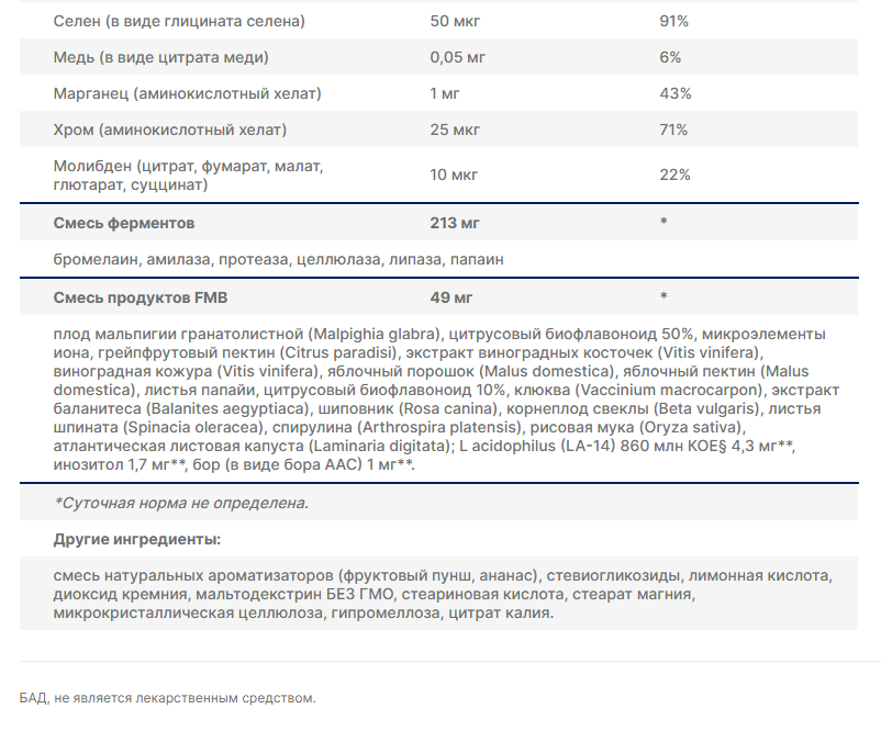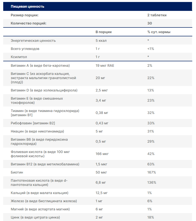 Среди ингредиентов — витамины группы B (B1, B2, B6, B12, фолиевая кислота), витамины A, C, D, E, цинк, магний, селен, марганец, хром, а также природные антиоксиданты из черники, винограда, яблока и других фруктов. Формула обогащена ферментами и пробиотиками для лучшего усвоения питательных веществ и поддержки пищеварения. Жевательные таблетки имеют приятный фруктовый вкус, что делает их прием легким и радостным даже для самых привередливых малышей. Без лишних сахара и искусственных красителей — только натуральные компоненты для здорового роста и развития.