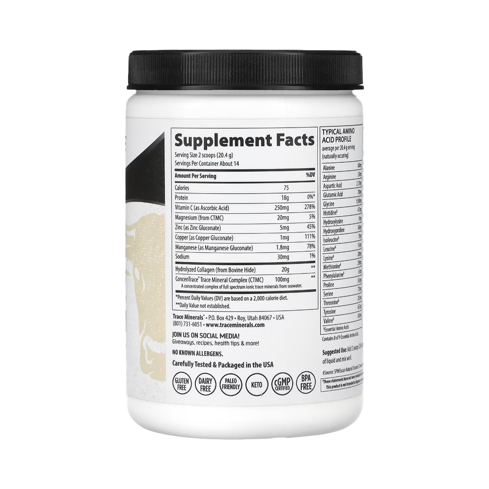 Если вы стремитесь к естественной красоте, энергии и здоровью — Trace Collagen Peptides станет вашим надёжным союзником. Это не просто коллаген, а инновационный комплекс гидролизованного коллагена из бычьей шкуры, обогащённый концентрированным комплексом ионизированных микроэлементов полного спектра ConcenTrace® из минеральной воды Большого Солёного озера в штате Юта. Каждая порция (20,4 г) содержит 20 г чистого коллагена — это один из самых высоких показателей на рынке, что обеспечивает быстрое и эффективное усвоение организмом.