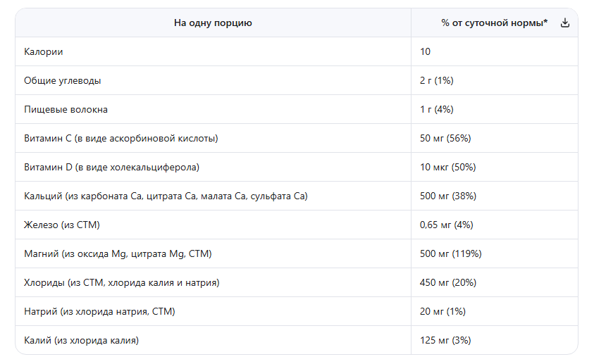 Добавка обогащена витамином D3 (10 мкг), который усиливает усвоение кальция, и витамином C (50 мг), поддерживающим иммунитет и участвующим в образовании коллагена. В состав также входят важные микроэлементы: железо, хлориды, калий, бор, а также экстракты трав и ягод — пшеничной травы, клевера, хвоща, водяного перца, клубники и грейпфрутовых семян — которые усиливают антиоксидантную защиту и способствуют общему оздоровлению.