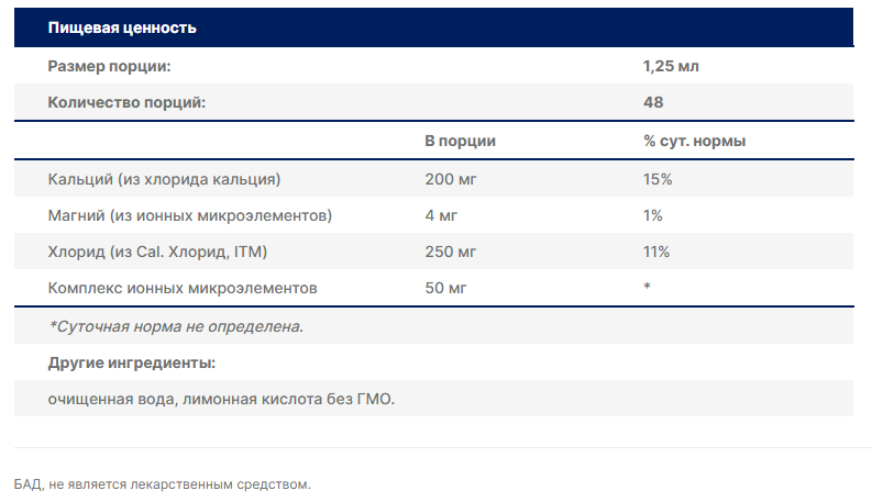 Добавка поддерживает прочность костей и зубов, способствует нормальному функционированию нервной и мышечной систем, а также помогает поддерживать здоровый уровень энергии и стабильное настроение. В состав также входят магний и хлорид, которые усиливают действие кальция, улучшая его усвоение и баланс в организме. Комплекс ионных микроэлементов обеспечивает дополнительную поддержку метаболических процессов.